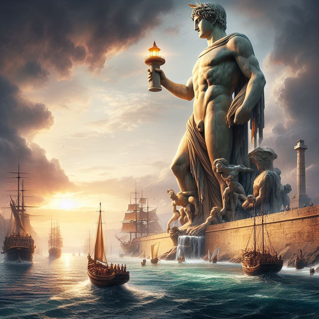 Dominating the skyline is the Colossus of the Docks, a statue so immense that its feet are planted on either side of the harbour, forming a gateway for the ships that pass beneath. This towering figure holds a lantern aloft, its light a constant sentinel for those navigating the treacherous waters, and a symbol of the city’s enduring bond with the sea.