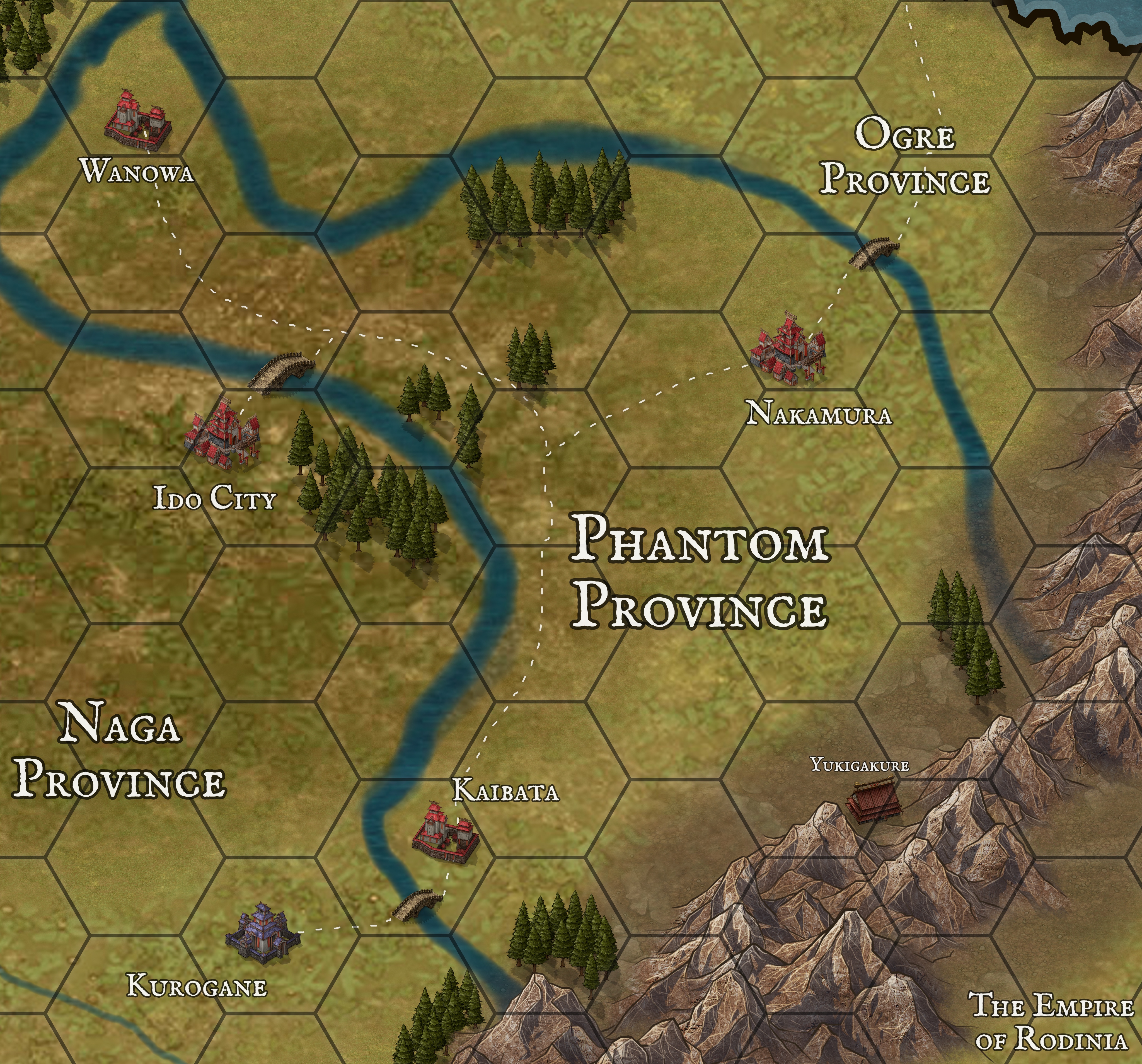 There are seven geographical provinces in Honshu: Naga Province is home to many of the empire's best poets and artists. The bulk of the empire's army comes from Gryphon Province with more samurai here than in any other province. Dragon Province is home to the famous Niten Dojo where samurai come from across the empire to be trained in this unusual and deadly style. Home of the emperors for the last century. Phantom Province is where the mysterious Ghostwalkers began life, but are now in use across the whole empire. Sphinx Province is home to the most powerful spellcasters and wu-jen. Kirin Province is a most unusual province, home to wild horse lords who many in the empire consider to be barbarians.Ogre Province provides most of the leaders who defend the southeast of the empire from the barbarians of Rodinia. Home clan of the current emperor.